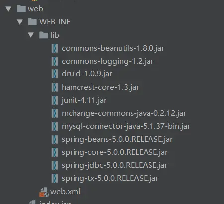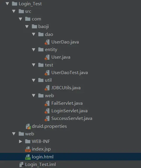 5、定义连接数据库的配置文件,编写功能为使用连接池连接数据库,封装为JDBCUtils的工具类,本文使用druid连接池和基于spring对原始jdbc封装的JDBCTemplate对象操作数据库,使用类加载器获取配置文件
