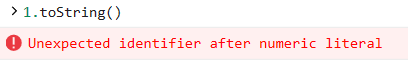 1.toString()会产生什么呢?没错!这里报错了,那为什么会报错呢?在百度翻译的帮助下我明白了这里的语法错误。 在JS中,点操作符意味着调用object的属性或者一个浮点数