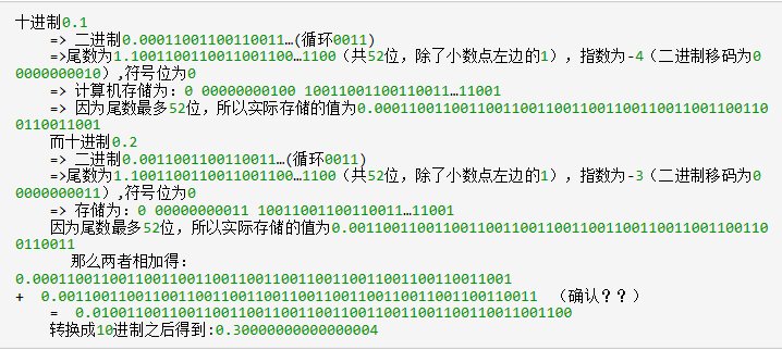 尤其是对于浮点数来讲,小数点后的位数是可以无穷尽的。当表示一个小数时,计算机会由于空间有限而对二进制的数据进行部分的舍弃。