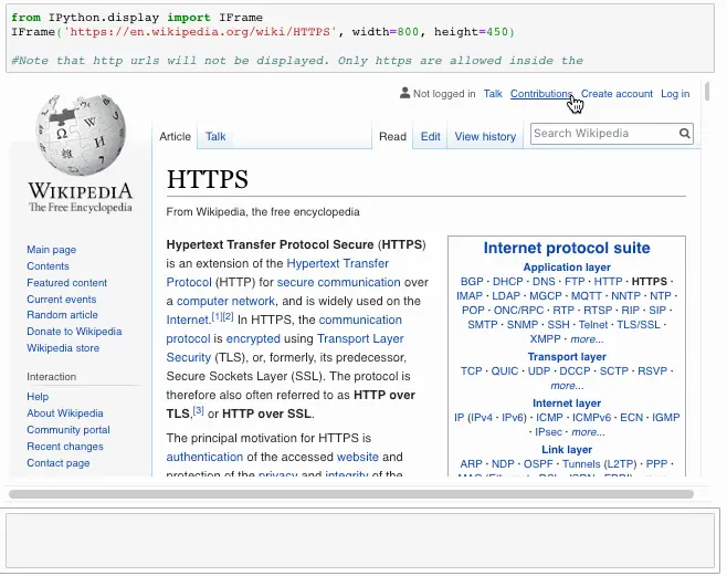 戳一下,一个可以边演示边改的PPT就好了。嵌入链接和pdf扔链接再跳转实在是太麻烦了,不如直接把素材放进Jupyter里面。嵌入链接1 #Note that http urls will not be displayed. Only https are allowed inside the Iframe 2 from IPython.display import IFrame 3 IFrame('en.wikipedia.org/wiki/HTTPS', width=800, height=450)操作方式如下,当然你需要把链接换成你要放的链接: