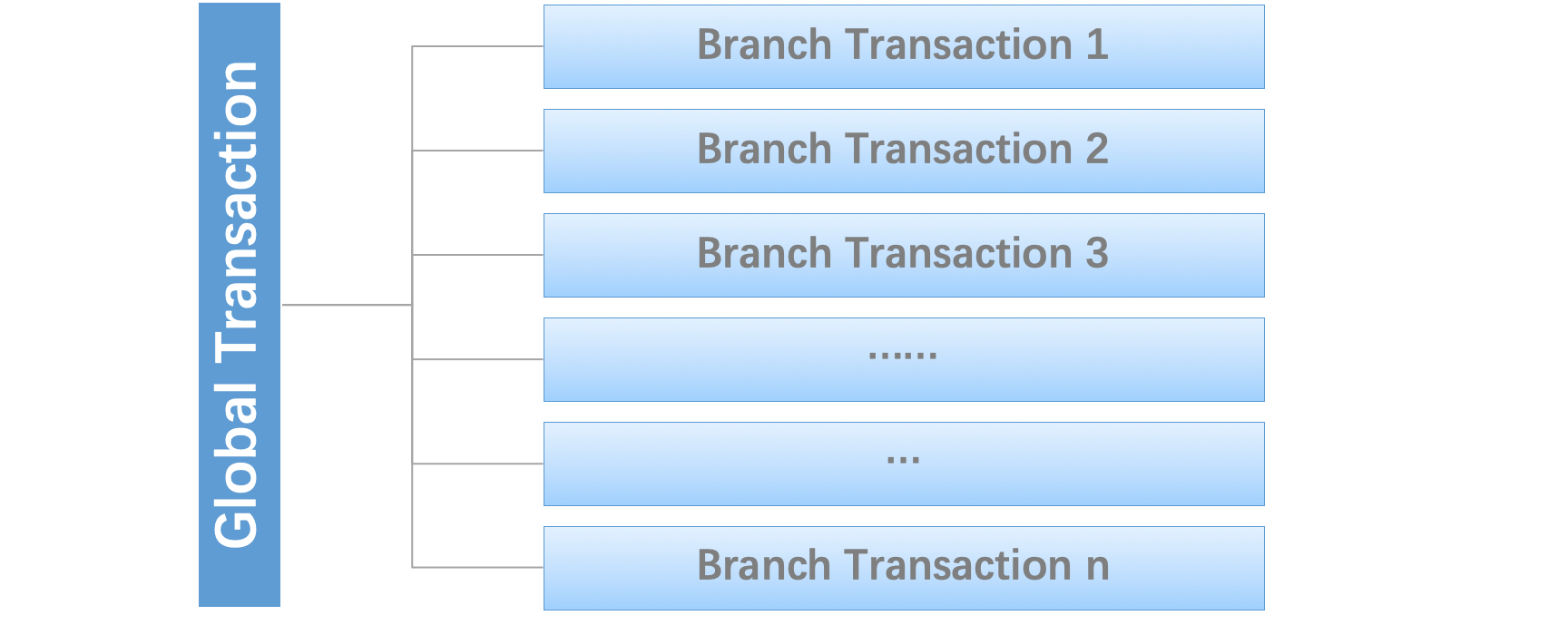 - 阶段1:分支(本地)事务执行。将一个本地事务做为一个分布式事务分支,所以若干个分布在不同微服务中的本地事务共同组成了一个全局事务,结构如下。