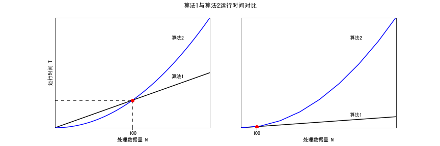 的大小,或者说要处理的数据量大小。当数据量很小时,算法1要比算法2花费更多时间;当