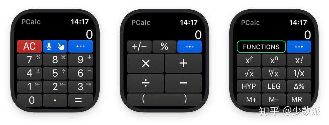 除了直接点击按键输入算式,PCalc 还支持通过语音、手写或者转动数字表冠的方式输入数字和算式。除了数字键盘,应用还内置了运算符键盘和功能键盘,前者可以让我们更方便地选择运算符号,后者支持单位换算、函数和三角函数运算等高级功能,不仅在使用体验方面比系统计算器工具好出不少,功能也更加强大。
