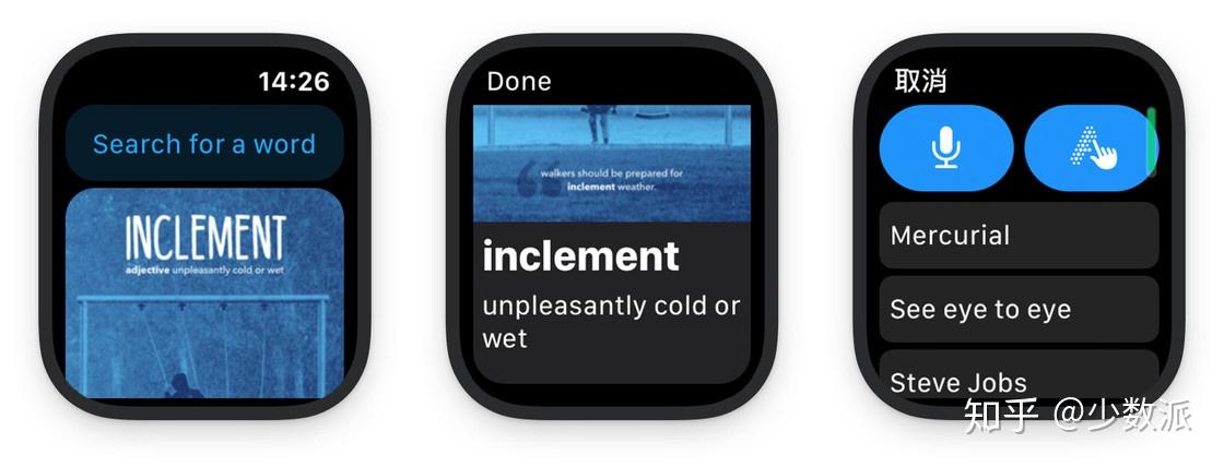 在搜索界面,LookUp 会展示 3 个热门单词或词组,我们可以快速选择感兴趣的词查看释义。应用的搜索功能提供了语音和手写两种方式,不过,考虑到中文环境下 Siri 对于英文的识别准确率不够高,在 Apple Watch 这块小屏幕上手写单词也不是很方便,使用 LookUp 查单词的体验还不是特别好。