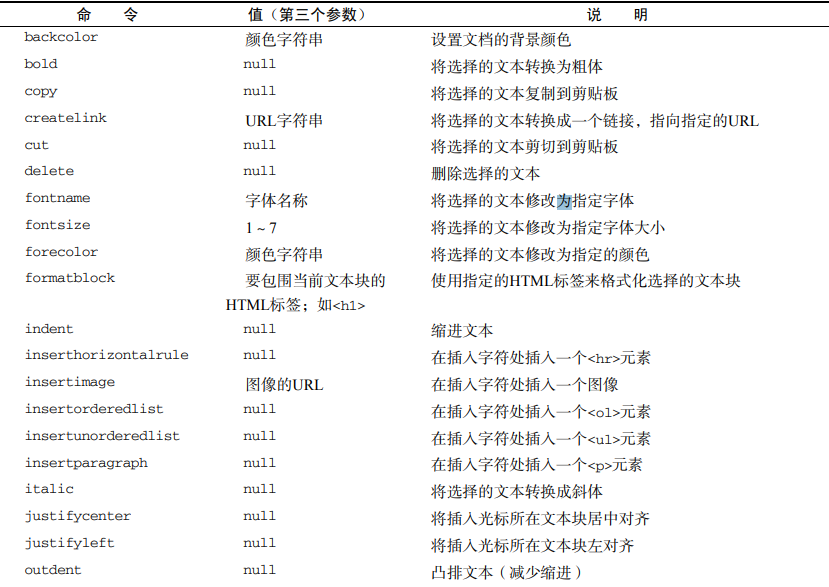 用document.execCommand()方法,三个参数:要执行的命令、表示浏览器是否应该为当前命令提供用户界面的一个布尔值和执行命令的值,以下是部分命令