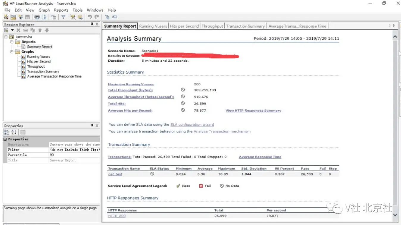从上面的测试结果看,LoadRunner共计运行5分32秒,发送请求26599次,最小响应时间为0.024秒,平均响应时间为0.36秒,最大响应时间为18.05秒,90分位数为0.287秒,无失败的访问。