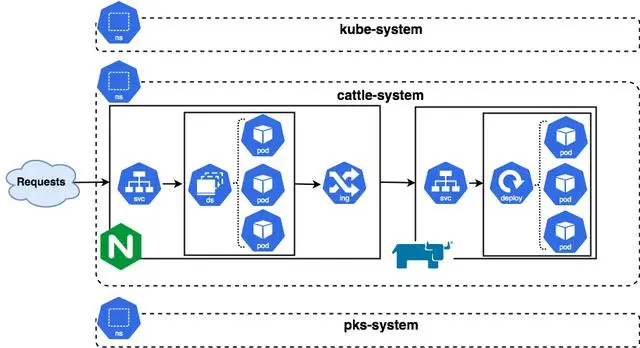 外部请求通过Nginx controller中的LoadBalance服务类型进入集群。从该服务构建的端点列表中选择一个nginx controller,进而匹配ingress controller中的规则。该请求将转发到Rancher Service,最后到与该服务上的标签selector匹配的pod。