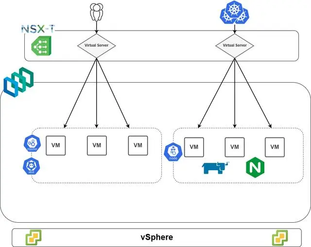 理论上说,我们在底部有一个vSphere栈,它在我们本地的SDDC中托管这个环境。接下来,我们通过PKS构建了一个3-master和3-worker的Kubernetes集群。除了许多其他系统容器(未在上图显示)之外,worker还托管Rancher pod和Nginx pod。基于以上,我们使用NSX-T提供的负载均衡器来提供两个主要虚拟的服务器:一个用于控制平面访问,另一个用于ingress访问。