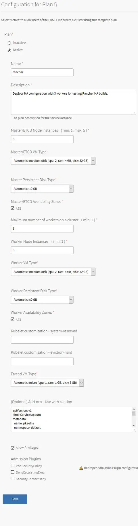 $ pks create-cluster czpksrancher05 -e czpksrancher05.sovsystems.com -p rancher --network-profile lb-medium
