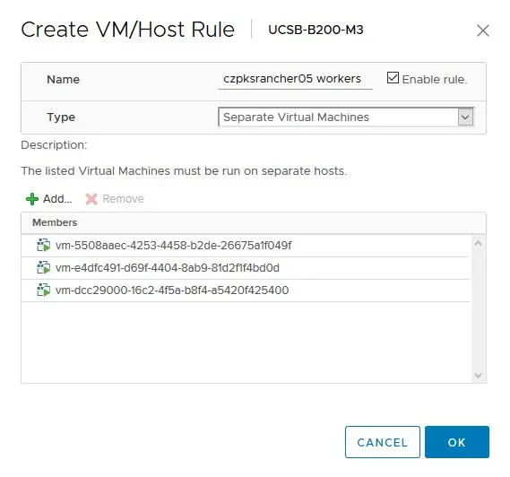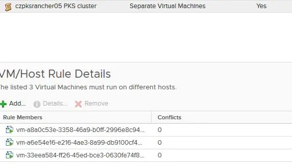 为worker创建一个新的反关联规则,并添加所有规则。由于BOSH会使用UUID而不是实际名称来部署它们,因此在列表中找到它们十分困难,但是你可以在vSphere VM和模板清单视图中找到它们(如果你使用-ProcessDRSRules标志运行Optimize-VMware-PKS),或者你可以在引用部署后,从BOSH CLI获取名称。