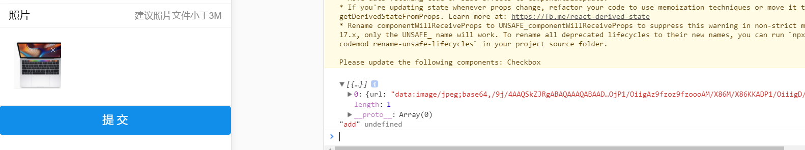 再次记录一下antd-mobile里面上传文件的,是用form-data的方式 xishanxu 2019-10-15 4,453 阅读1分钟 使用react 写了一个小小的web app项目,其中有一个表单提交用到了图片上传 这我使用antd-mobile上传了一个图片,然后返回值是一个数组,数组里面是很多个对象,代表可以上传多张图片 然后我们看看,对象里面的结构,其中url 代表图片的url ,是本地的,是antd-mobile给我们转换成了base64格式的,可以用于在本地显示图片,然后这个时候我表单提交的话,我需要把这张图片上传给后端怎么办? 我在脚手架中使用的是axios来请求发送数据 然后这里需要注意的是,需要先把这个上传给后端的这个字段格式转换成文件格式 上代码 new FormData() 转换成file格式 然后axios设置content-type,搞定