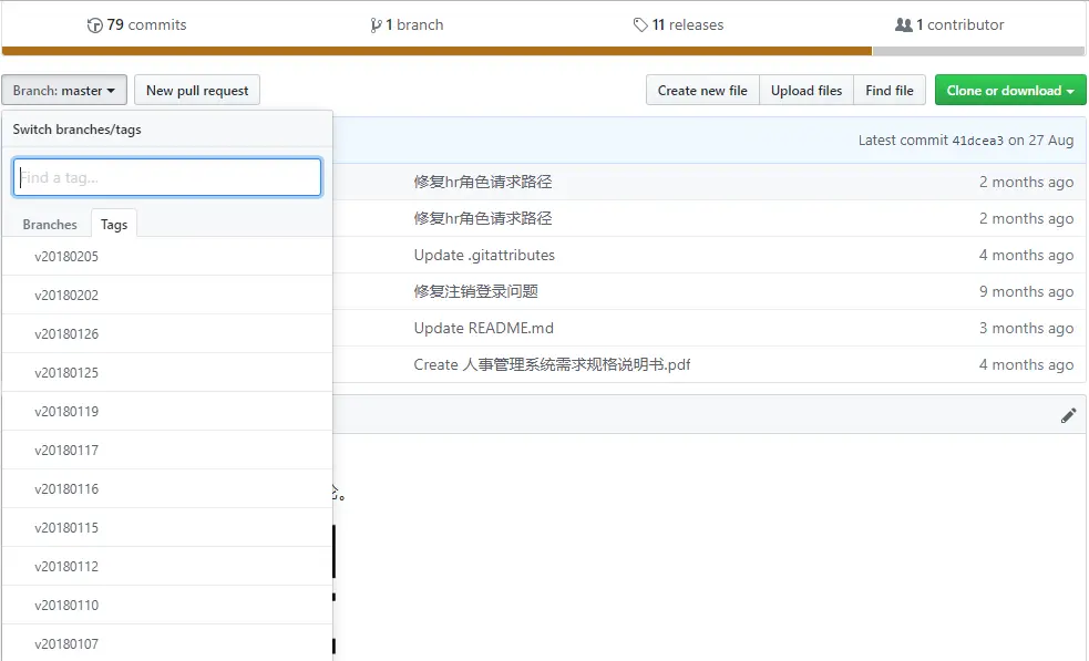 同时我考虑到很多小伙伴第一次接触到这个项目,一个庞然大物不好处理,因此我在每一次项目提交之前,都会对项目打一个 tag,这样大家通过 git clone 命令获取到项目之后,就可以通过 tag 非常方便的定位到项目的任意时刻,例如只想看登录设计的,可以根据文档介绍回到 v20180107 这个版本: