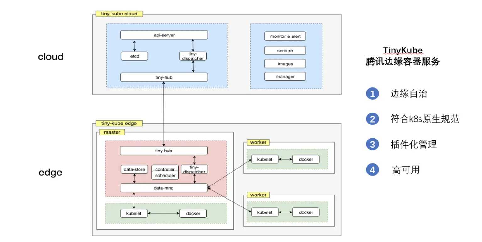 TinyKube边缘容器服务,包含了cloud和edge两个大部分,edge主要为用户提供了运行在边缘计算设备上的容器集群,该集群采用插件化的安装模式,同时对运行的资源占用做了高度的优化和剪裁,极大的减少了集群运行的资源占用,edge还对网络传输做了优化,可以保证在弱网的环境下容器集群运行的高可用。Cloud部分实现了对集群进行统一的管理和编排,符合k8s的API规范,满足通用性的管理需求。