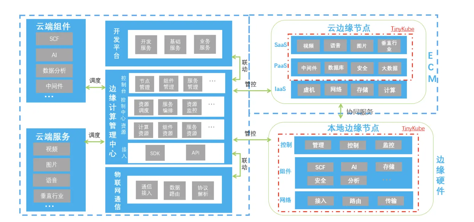 IECP通过云中心节点来统一管理用户的云边缘节点和本地边缘计算节点,同时将云端的AI、中间件、函数计算、数据分析等能力以docker镜像的方式快速的部署到用户的边缘节点上,同时还为用户提供了腾讯自研的云原生容器管理服务TinyKube,来为用户提供边缘容器服务,降低用户管理和运维的成本。