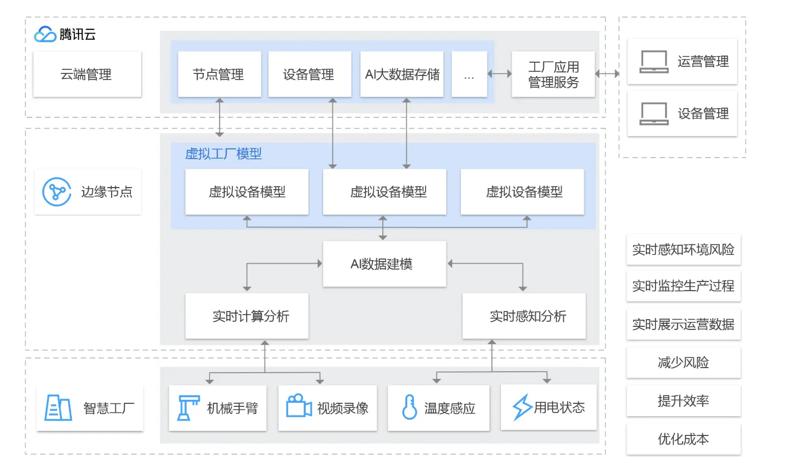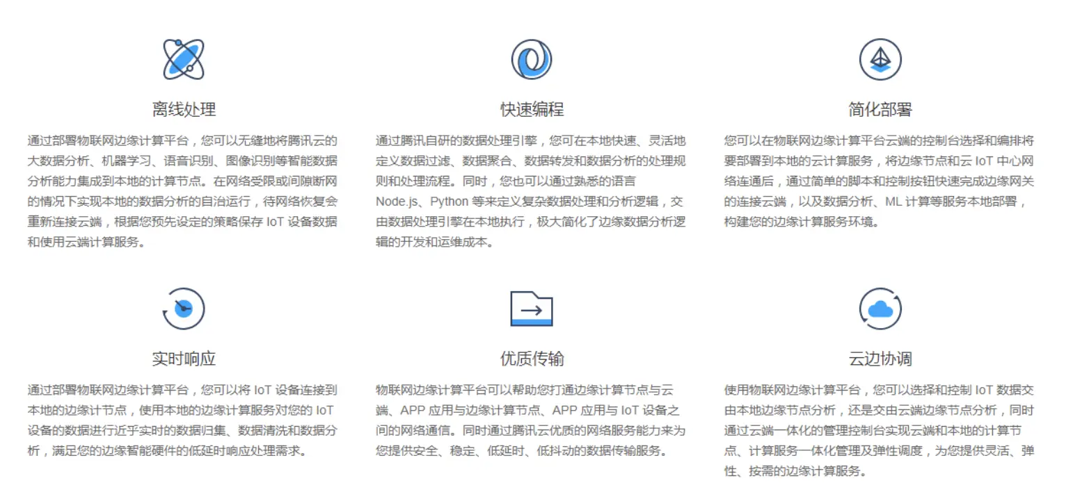 最后我们来看一下腾讯云物联网边缘计算平台(IECP)的整体产品架构,首先IECP通过与腾讯物联网开发平台和物联网通信平台的联动,来为用户提供物联网设备硬件快速的开发和设备数据快速的上传云端,减少智能硬件的开发时间和研发成本,其次通过打通云端函数计算、ML 计算、流式计算等计算服务,您可以方便地在本地使用云函数、AI 模型、流式分析等能力对设备数据进行处理与响应,节约您的运维、开发、网络带宽等成本消耗。