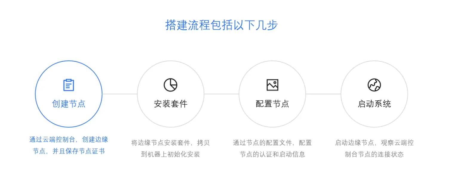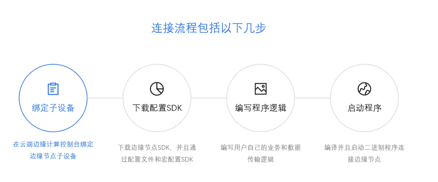 最后简单介绍一下如何通过腾讯云物联网边缘计算平台来搭建您的边缘计算节点和使用设备开发的SDK包来完成物联网设备与您创建的边缘计算节点的连接。目前IECP还处产品内测阶段,仅对部分内测申请通过的用户提供免费试用,用户可以通过内测申请页面来申请试用,内测申请通过后会有专人与您电话沟通,并且提供给您相关的安装包及SDK开发包。之后您只需通过官网的产品文档就可以完成边缘节点的创建和设备的连接,节点搭建和设备连接简单流程分别如下图所示: