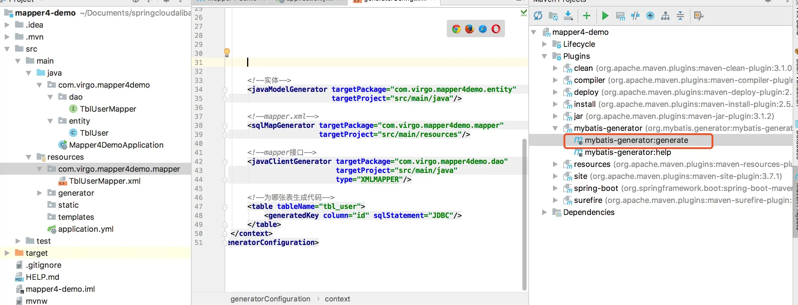 <javaModelGenerator targetPackage="com.virgo.mapper4demo.entity"