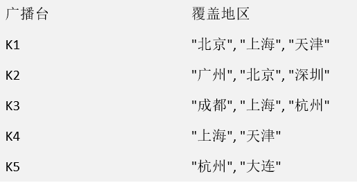 假设存在下面需要付费的广播台,以及广播台信号可以覆盖的地区。 如何选择最少的广播台,让所有的地区都可以接收到信号