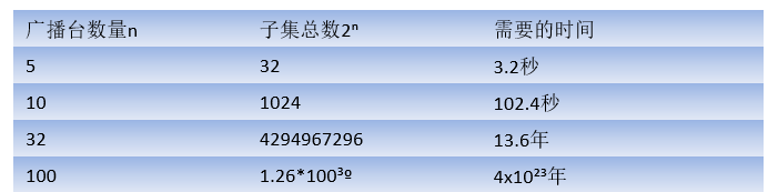 如何找出覆盖所有地区的广播台的集合呢,使用穷举法实现,列出每个可能的广播台的集合,这被称为幂集。假设总的有n个广播台,则广播台的组合总共有2ⁿ -1 个,假设每秒可以计算10个子集, 如图: