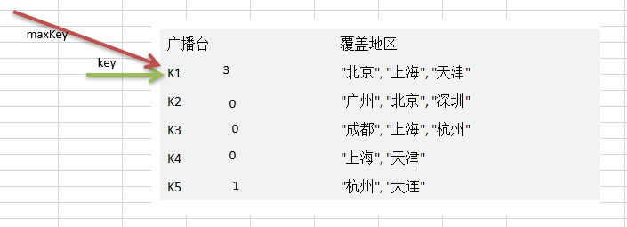 //定义给maxKey , 保存在一次遍历过程中,能够覆盖最大未覆盖的地区对应的电台的key