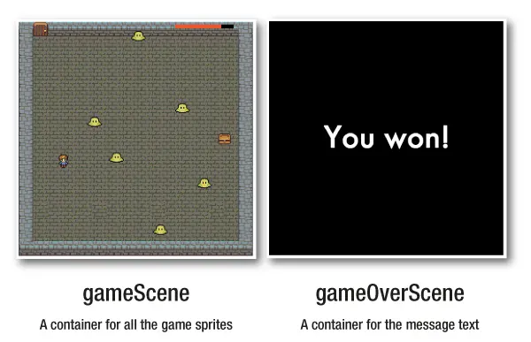 它只是翻转游戏场景的可见性。这是隐藏gameScene并在游戏结束时显示gameOverScene的内容。 这是一个非常简单的示例,说明了如何切换游戏状态,但是可以在游戏中拥有任意数量的游戏状态,并根据需要填充尽可能多的代码。只需将state的值更改为要在循环中运行的任何函数。 而这正是寻宝猎人的全部!只需多做一些工作,就可以将这个简单的原型变成完整的游戏-试试吧!