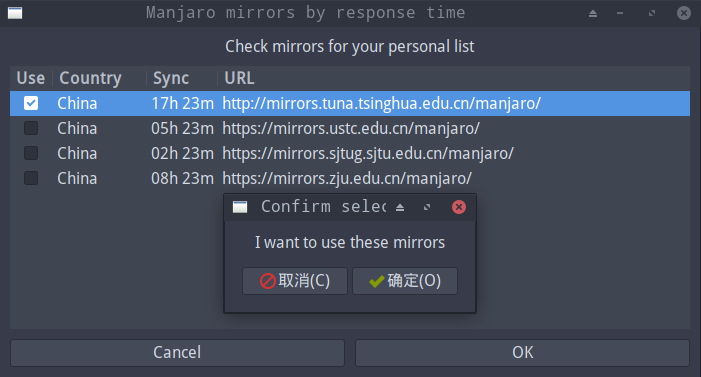 7 0.557 China : http://mirrors.tuna.tsinghua.edu.cn/manjaro/
