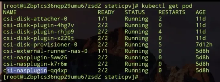 静态 Provisioning 主要用的是阿里云的 NAS 文件存储;动态 Provisioning 主要用了阿里云的云盘。它们需要相应存储插件,插件我已经提前部署在我的 K8s 集群中了(csi-nasplugin 是为了在 K8s 中使用阿里云 NAS 所需的插件,csi-disk 是为了在 K8s 中使用阿里云云盘所需要的插件)。