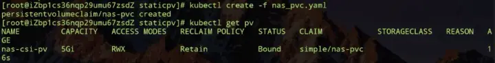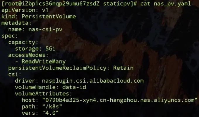 volumeAttributes 是我在阿里云 nas 控制台预先创建的 NAS 文件系统的相关信息,我们主要需要关心的有 capacity 为 5Gi; accessModes 为多 node 读写访问; reclaimPolicy:Retain,也就是当我使用方的 PVC 被删除之后,我这个 PV 是要保留下来的;以及在使用这个卷的过程中使用的 driver。