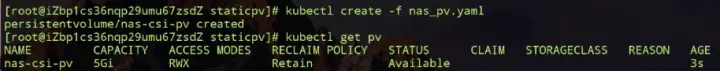上图显示,它已经被删掉了。再看一下,刚才的 nas PV 还是在的,它的状态是处在 Released 状态,也就是说刚才使用它的 PVC 已经被删掉了,然后它被 released 了。又因为我们 RECLAIN POLICY 是 Retain,所以它这个 PV 是被保留下来的。