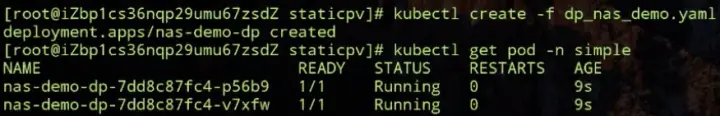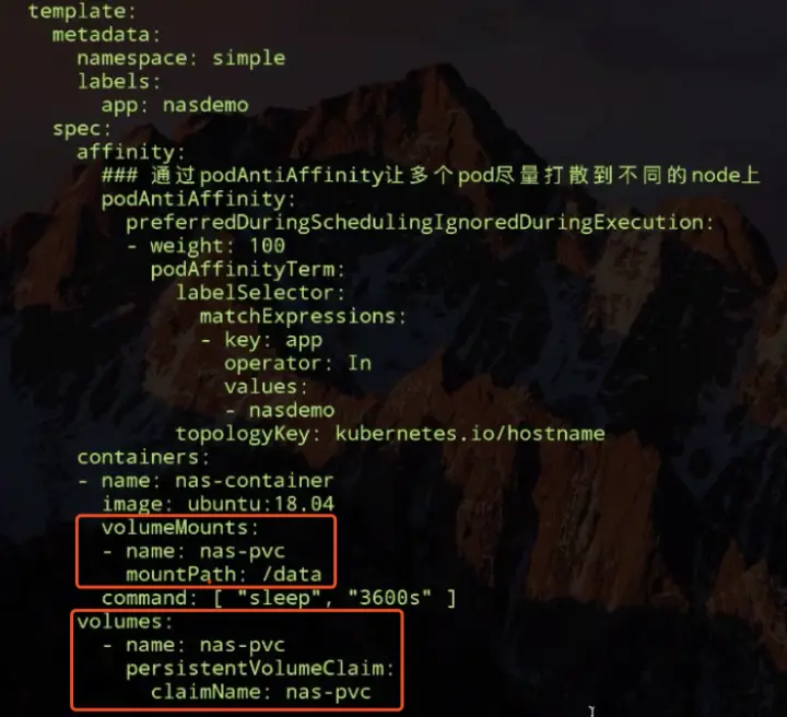 pod yaml 里面声明了刚才我们创建出来的 PVC 对象,然后把它挂载到 nas-container 容器中的 /data 下面。我们这个 pod 是通过 deployment 创建两个副本,通过反亲和性,将两个副本调度在不同的 node 上面。