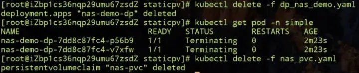 接下来我们看一下把两个 pod 删掉之后的情况。先删 Pod,接着再删一下对应的 PVC(K8s 内部对 pvc 对象由保护机制,在删除 pvc 对象时如果发现有 pod 在使用 pvc,pvc 是删除不掉的),这个可能要稍等一下。