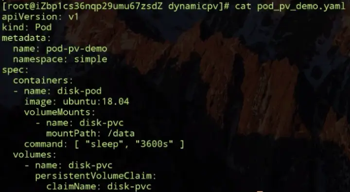 pod yaml 很简单,也是通过 PVC 声明,表明使用这个 PVC。然后是挂载点,下面我们可以创建看一下。