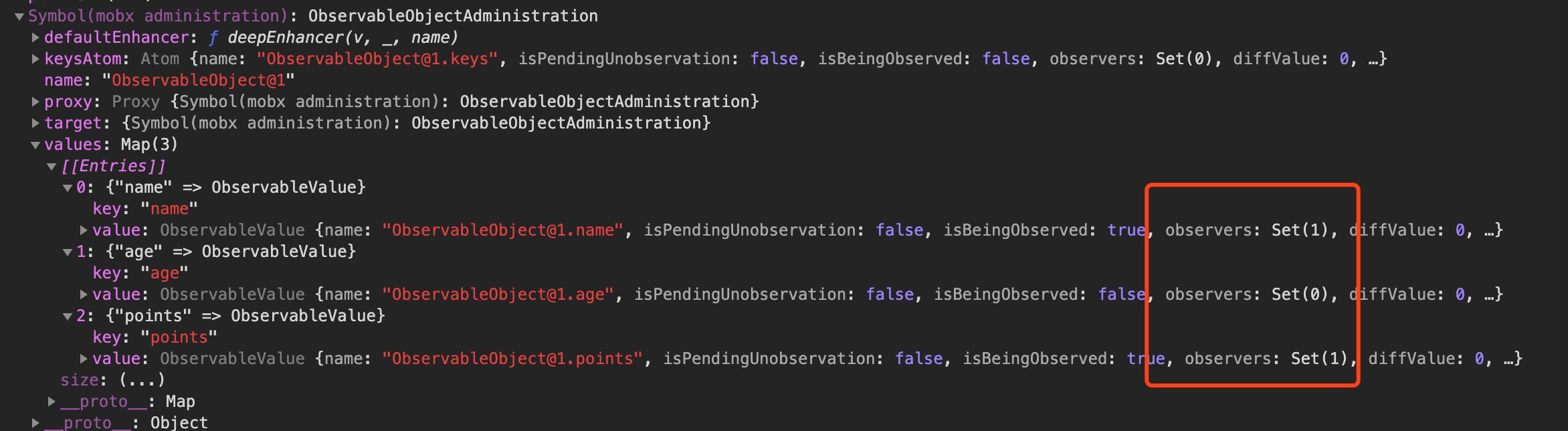 (3)执行bindDependencies(derivation);最后是通过执行这步,将reaction挂载在$mobx.values[index].observers上的,稍候介绍。