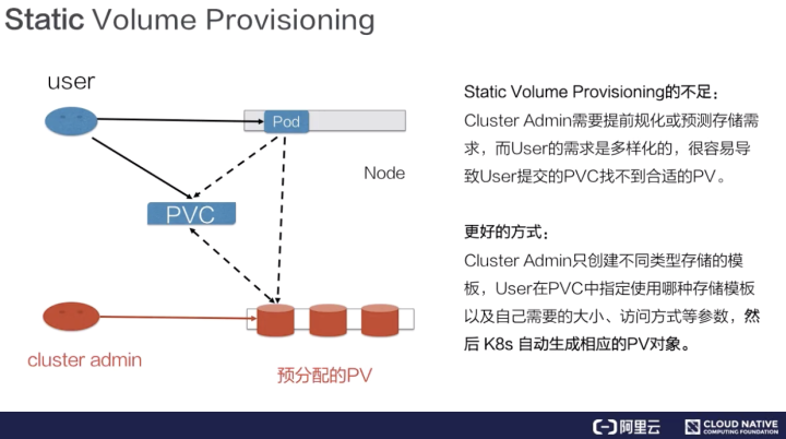 静态产生方式有什么不足呢?可以看到,首先需要集群管理员预分配,预分配其实是很难预测用户真实需求的。举一个最简单的例子:如果用户需要的是 20G,然而集群管理员在分配的时候可能有 80G 、100G 的,但没有 20G 的,这样就很难满足用户的真实需求,也会造成资源浪费。有没有更好的方式呢?