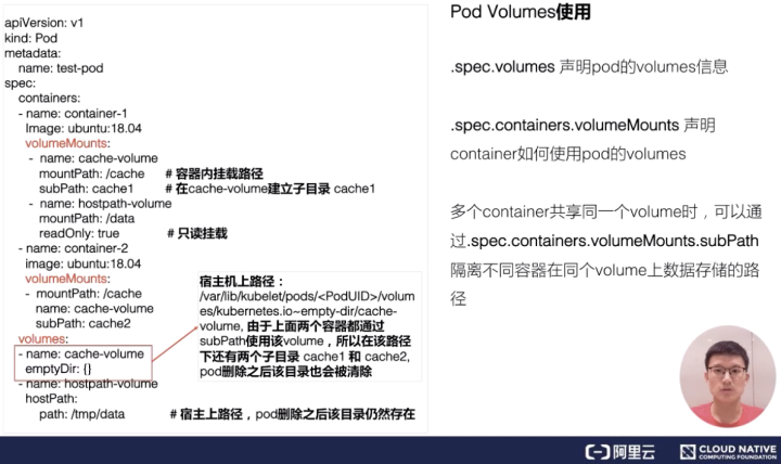 先看一下,这两个容器都指定使用了同一个卷,就是这个 cache-volume。那么,在多个容器共享同一个卷的时候,为了隔离数据,我们可以通过 subPath 来完成这个操作。它会在卷里面建立两个子目录,然后容器 1 往 cache 下面写的数据其实都写在子目录 cache1 了,容器 2 往 cache 写的目录,其数据最终会落在这个卷里子目录下面的 cache2 下。