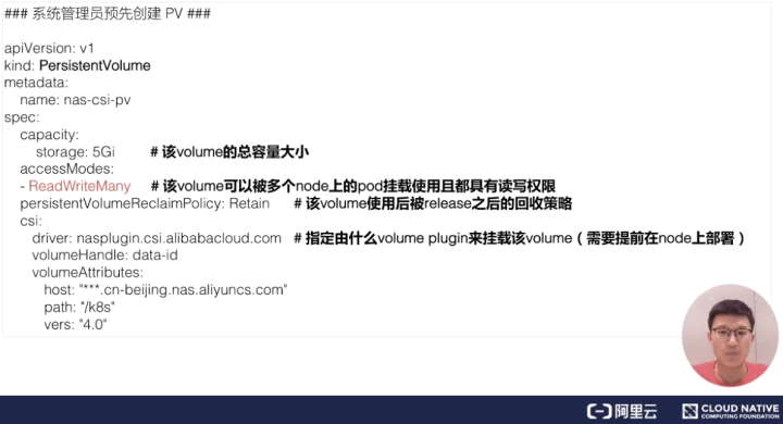 那么接下来看一下 yaml 怎么写。集群管理员首先是在云存储厂商那边先去把存储创建出来,然后把相应的信息填写到 PV 对象中。