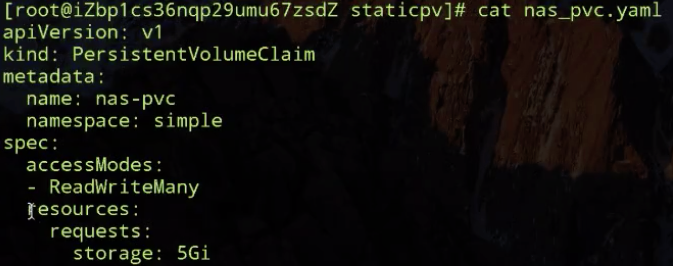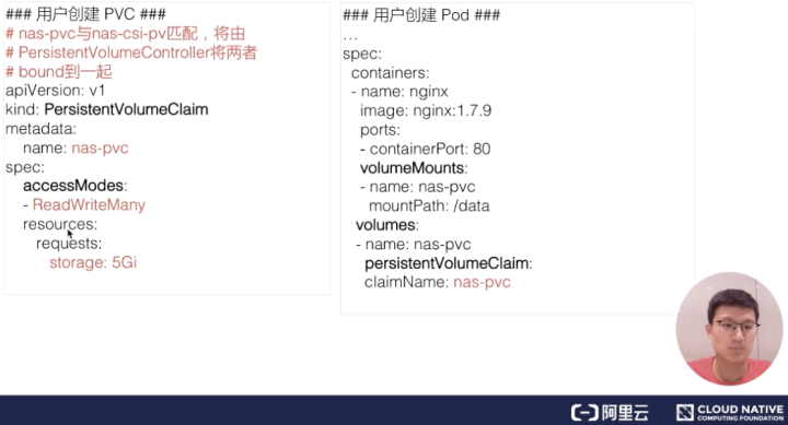 volumeAttributes 是我在阿里云 nas 控制台预先创建的 NAS 文件系统的相关信息,我们主要需要关心的有 capacity 为 5Gi; accessModes 为多 node 读写访问; reclaimPolicy:Retain,也就是当我使用方的 PVC 被删除之后,我这个 PV 是要保留下来的;以及在使用这个卷的过程中使用的 driver。