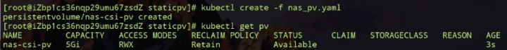 我们看一下上图 PV 的状态,已经处在 Available,也就是说它已经可以被使用了。