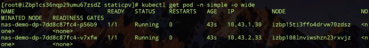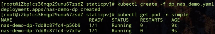 pod yaml 里面声明了刚才我们创建出来的 PVC 对象,然后把它挂载到 nas-container 容器中的 /data 下面。我们这个 pod 是通过 deployment 创建两个副本,通过反亲和性,将两个副本调度在不同的 node 上面。