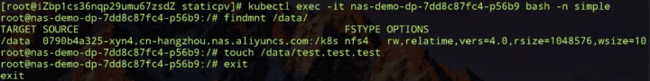 如下图所示:我们登陆到第一个上面,findmnt 看一下它的挂载信息,这个其实就挂载在我声明的 nas-fs 上,那我们再在下面 touch 个 test.test.test 文件,我们也会登陆到另外一个容器,看一下它有没有被共享。