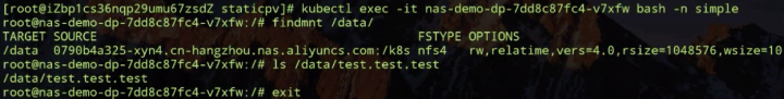 如下图所示:我们也 findmnt 一下,可以看到,这两个 pod 的远程挂载路径一样,也就是说我们用的是同一个 NAS PV,我们再看一下刚才创建出来的那个是否存在。