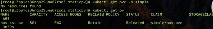 上图显示,它已经被删掉了。再看一下,刚才的 nas PV 还是在的,它的状态是处在 Released 状态,也就是说刚才使用它的 PVC 已经被删掉了,然后它被 released 了。又因为我们 RECLAIN POLICY 是 Retain,所以它这个 PV 是被保留下来的。