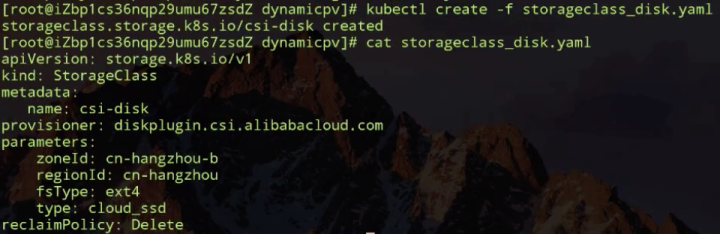 如上图所示,我事先指定的是我要创建存储的卷插件(阿里云云盘插件,由阿里云团队开发),这个我们已经提前部署好了;我们可以看到,parameters部分是创建存储所需要的一些参数,但是用户不需要关心这些信息;然后是 reclaimPolicy,也就是说通过这个 storageclass 创建出来的 PV 在给绑定到一起的 PVC 删除之后,它是要保留还是要删除。