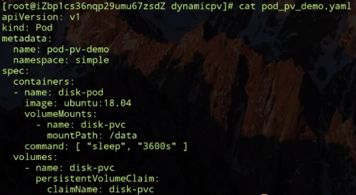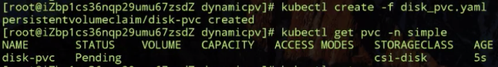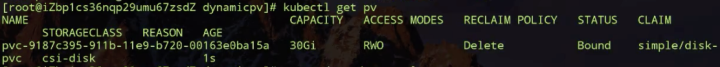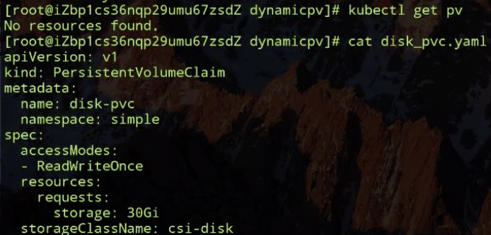 如上图所示:现在这个集群中是没有 PV 的,我们动态提交一个 PVC 文件,先看一下它的 PVC 文件。它的 accessModes-ReadWriteOnce (因为阿里云云盘其实只能是单 node 读写的,所以我们声明这样的方式),它的存储大小需求是 30G,它的 storageClassName 是 csi-disk,就是我们刚才创建的 storageclass,也就是说它指定要通过这个模板去生成 PV。