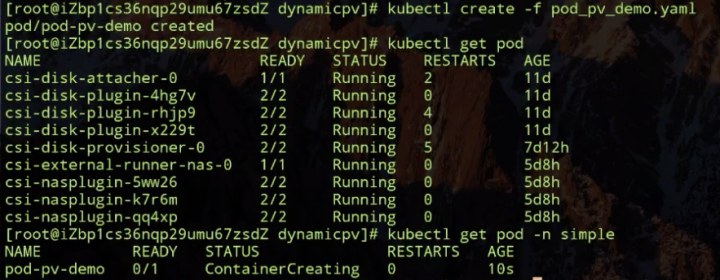 静态 Provisioning 主要用的是阿里云的 NAS 文件存储;动态 Provisioning 主要用了阿里云的云盘。它们需要相应存储插件,插件我已经提前部署在我的 K8s 集群中了(csi-nasplugin 是为了在 K8s 中使用阿里云 NAS 所需的插件,csi-disk 是为了在 K8s 中使用阿里云云盘所需要的插件)。