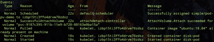 如下图所示:我们可以大概看一下 Events,首先被调度器调度,调度完之后,接下来会有个 attachdetach controller,它会去做 disk 的 attach 操作,就是把我们对应的 PV 挂载到调度器调度的 node 上,然后Pod对应的容器才能启动,启动容器才能使用对应的盘。