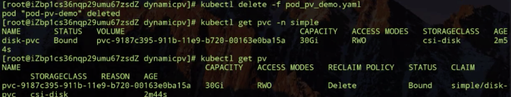 接下来我会把 PVC 删掉,看一下 PV 会不会根据我们的 reclaimPolicy 随之删掉呢?我们先看一下,这个时候 PVC 还是存在的,对应的 PV 也是存在的。
