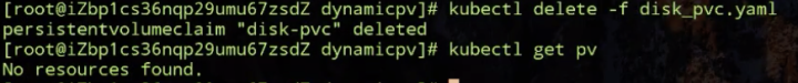 然后删一下 PVC,删完之后再看一下:我们的 PV 也被删了,也就是说根据 reclaimPolicy,我们在删除 PVC 的同时,PV 也会被删除掉。