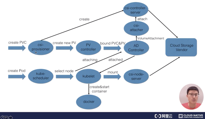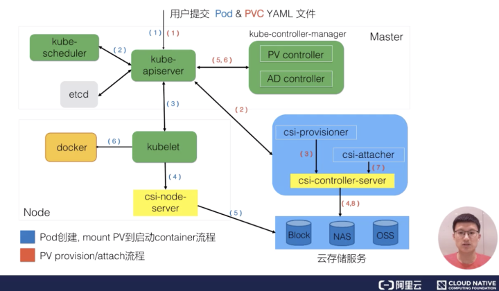 我们接下来看一下 K8s 中的 PV 和 PVC 体系的完整处理流程。我首先看一下这张图的右下部分里面提到的 csi。