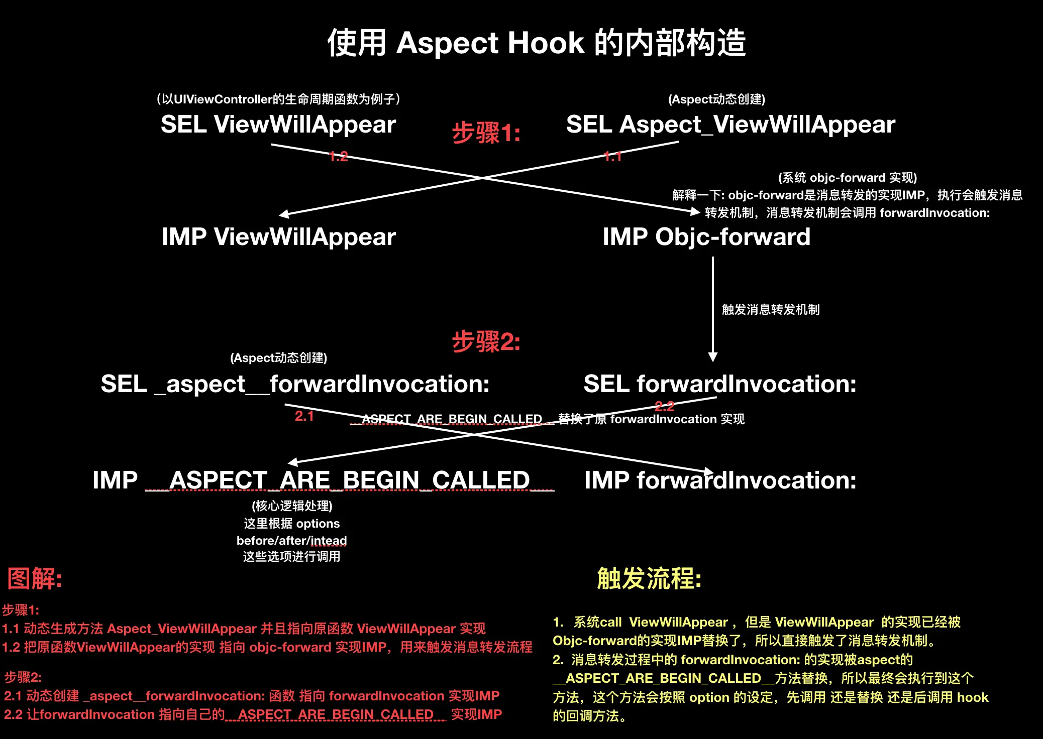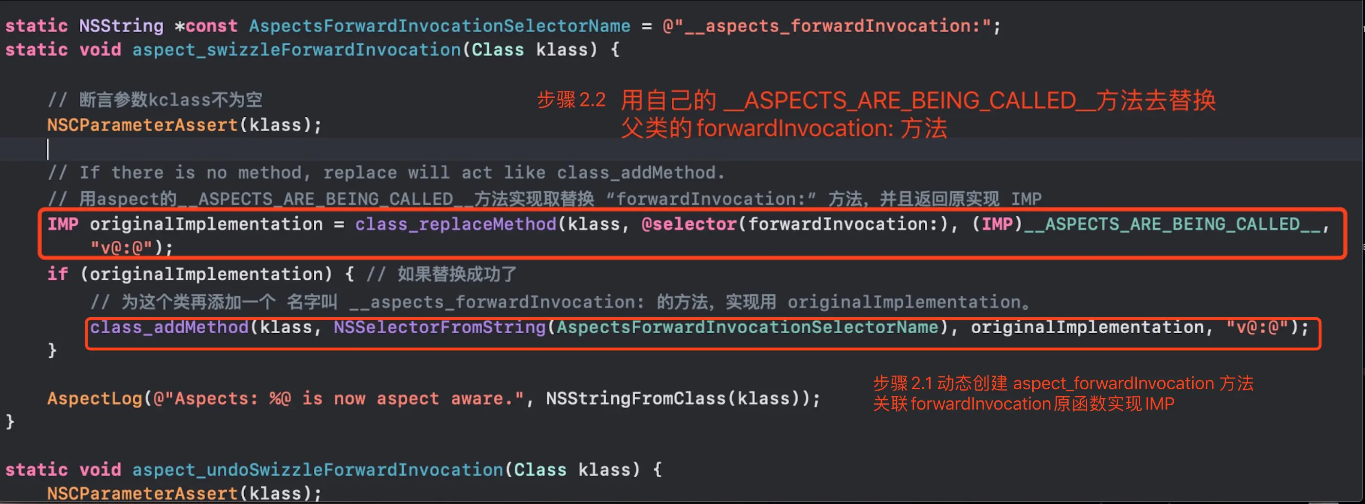 // 又因为 aspect 用 __ASPECTS_ARE_BEING_CALLED__ 替换了 消息转发流程中的 forwardInvocation 函数